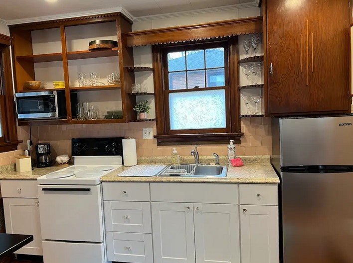 Wright’s Cottage offers 1 bedroom and bath. There is a full kitchen and one living room area. The back sunroom contains the washer and dryer. It is everything you need except it’s miniature, compact…tiny.